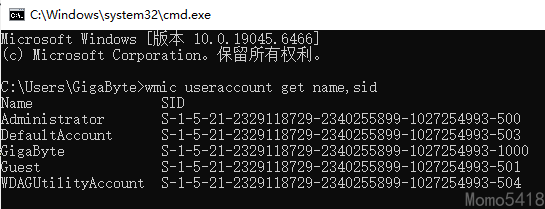 您可以通过运行以下命令找到您当前的 SID wmic useraccount get name,sid