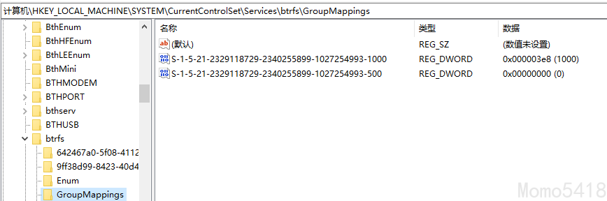 用户映射存储在注册表项 HKLM\SYSTEM\CurrentControlSet\services\btrfs\Mappings 中。创建一个 DWORD 值,其名称为您的 Windows SID(例如 S-1-5-21-1379886684-2432464051-424789967-1001),其值为您的 Linux 用户 ID(例如 1000)。